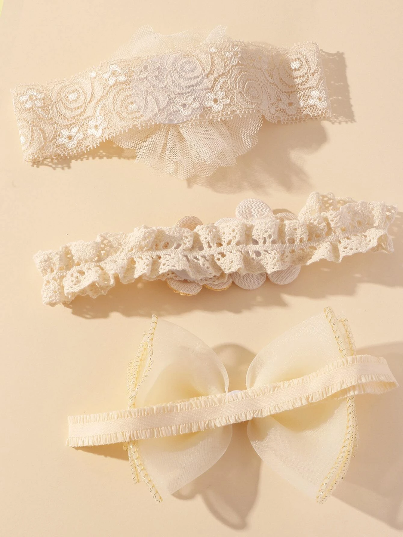 V kompletu prejmete 3 trakove na nežni, elastični čipki v bež barvi.