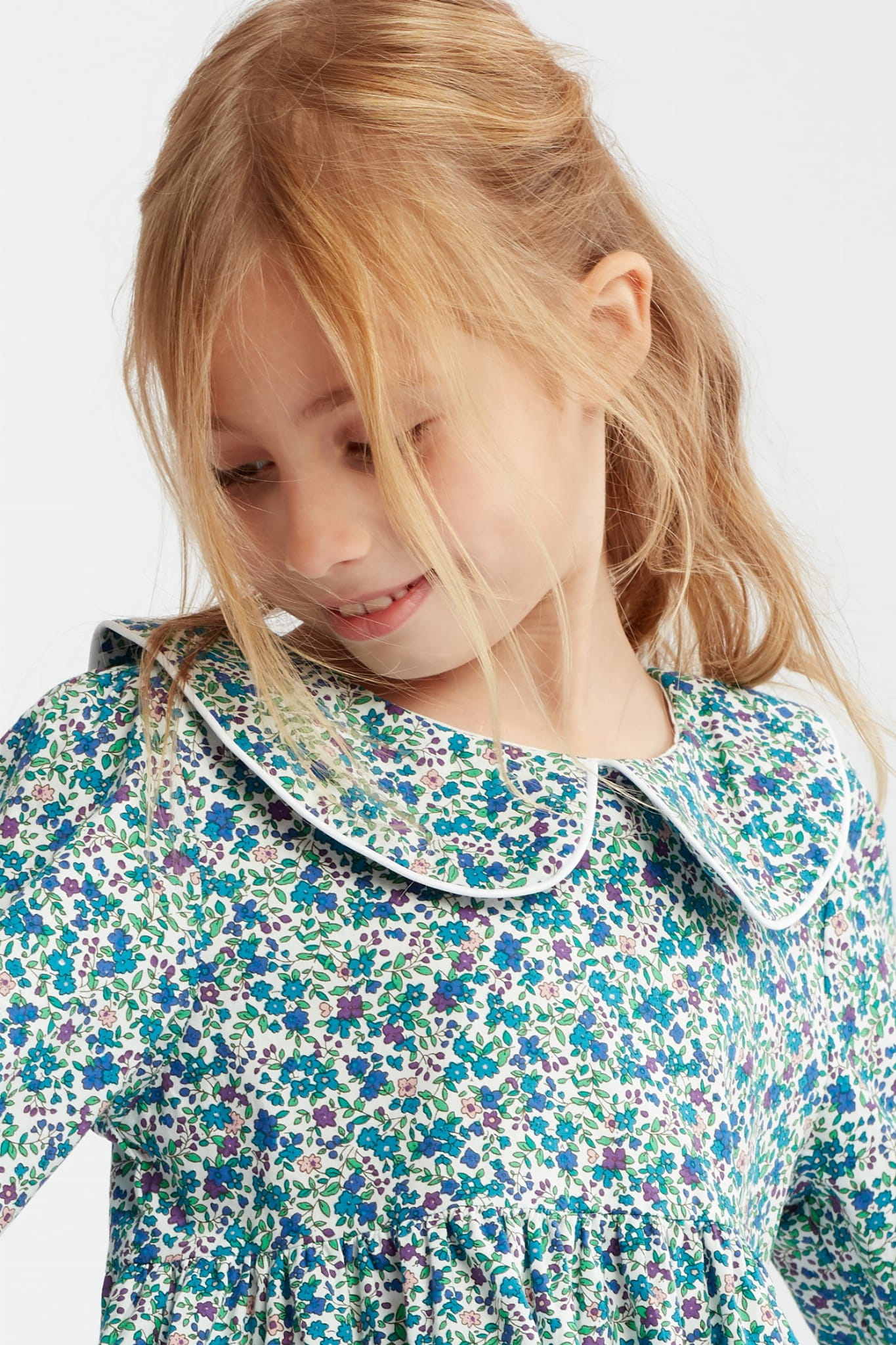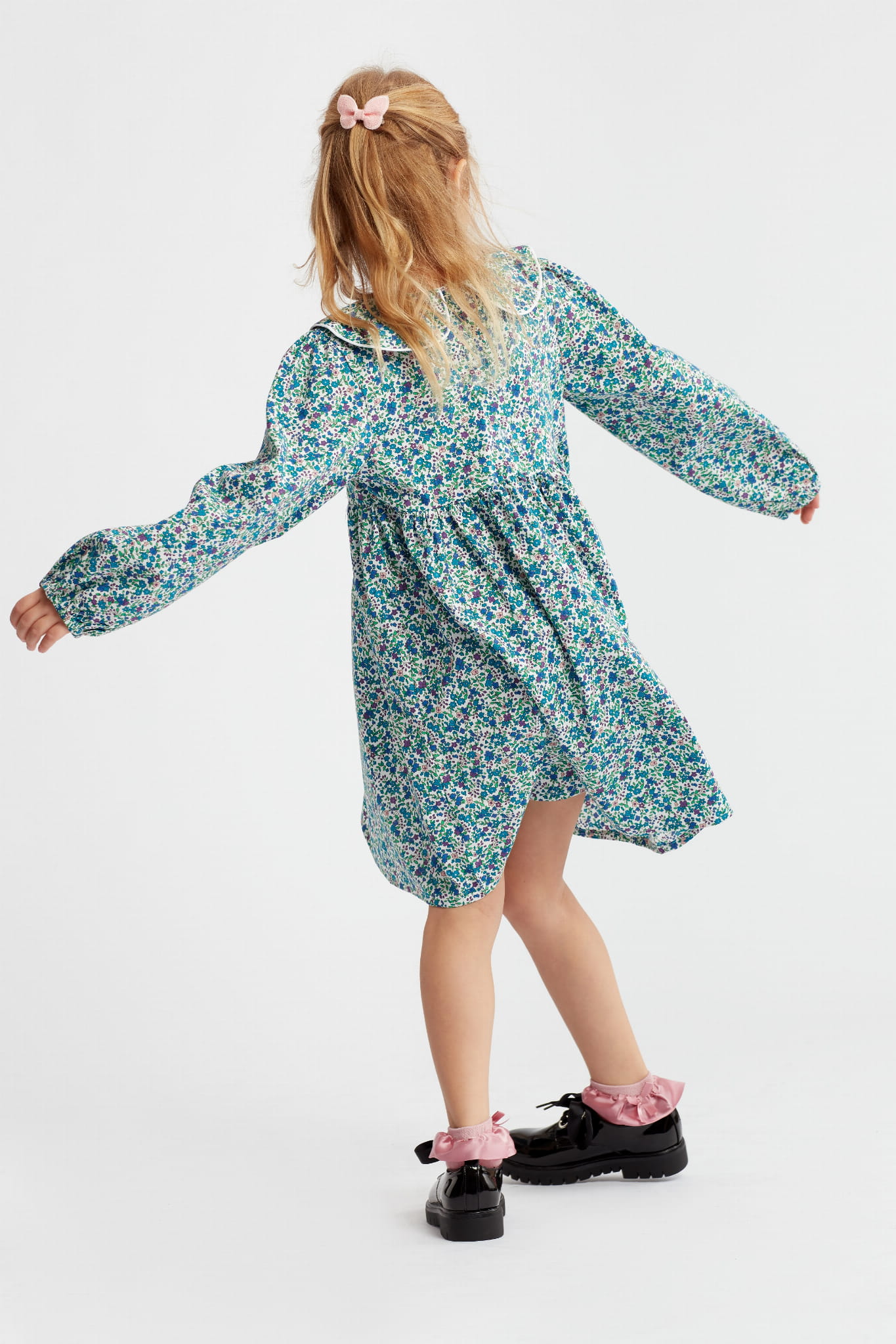 Obleka bo odlično poudarila lepoto vašega otroka, ki bo videti poseben. Eleganten ovratnik in nabor v višini prsi dajeta obleki dekliški čar.