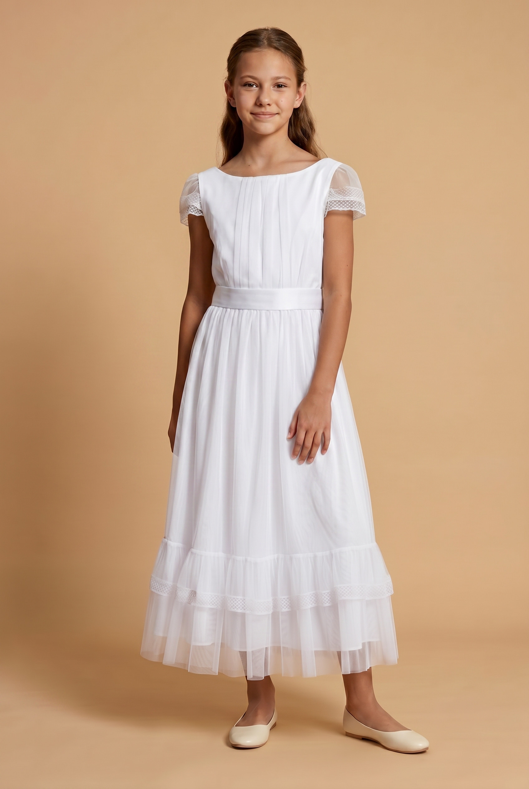 Spodnji del obleke je izdelan iz lepo urejenega tila. Izjemen čar daje obleki impresivno dodelan zgornji del z rokavi in volančki spodaj. Obleka je izdelana iz visokokakovostnega materiala, ki zagotavlja udobje pri nošenju. Dodatek je pas, ki se zadaj zapenja z zadrgo, s pentljo.
