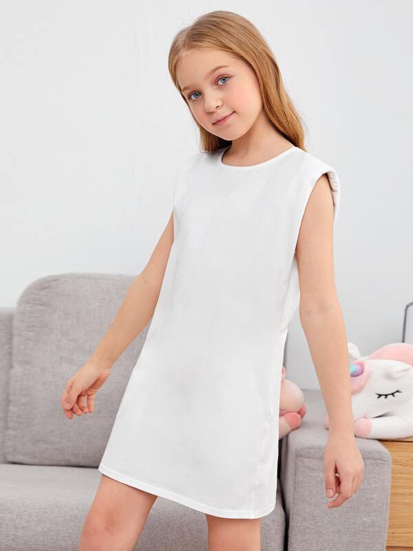Dekliška obleka iz mehkega, prijetnega bombaža v obliki cevi. Blazinice, všite v rokave, dodajo obleki čar. Za udobje nošenja sta v obleko všita dva žepa.