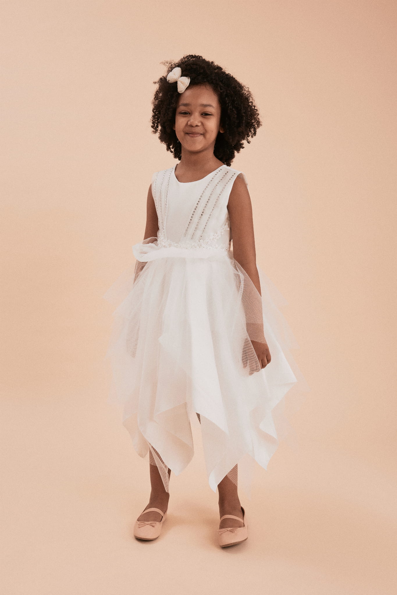 Predstavljamo obleko Monica za dekleta v beli barvi. Ta edinstvena obleka navdušuje z izjemnim šarmom in eleganco, ki ju poudarjajo presenetljivi okraski na zgornjem delu obleke in večplastno oblikovan spodnji del.