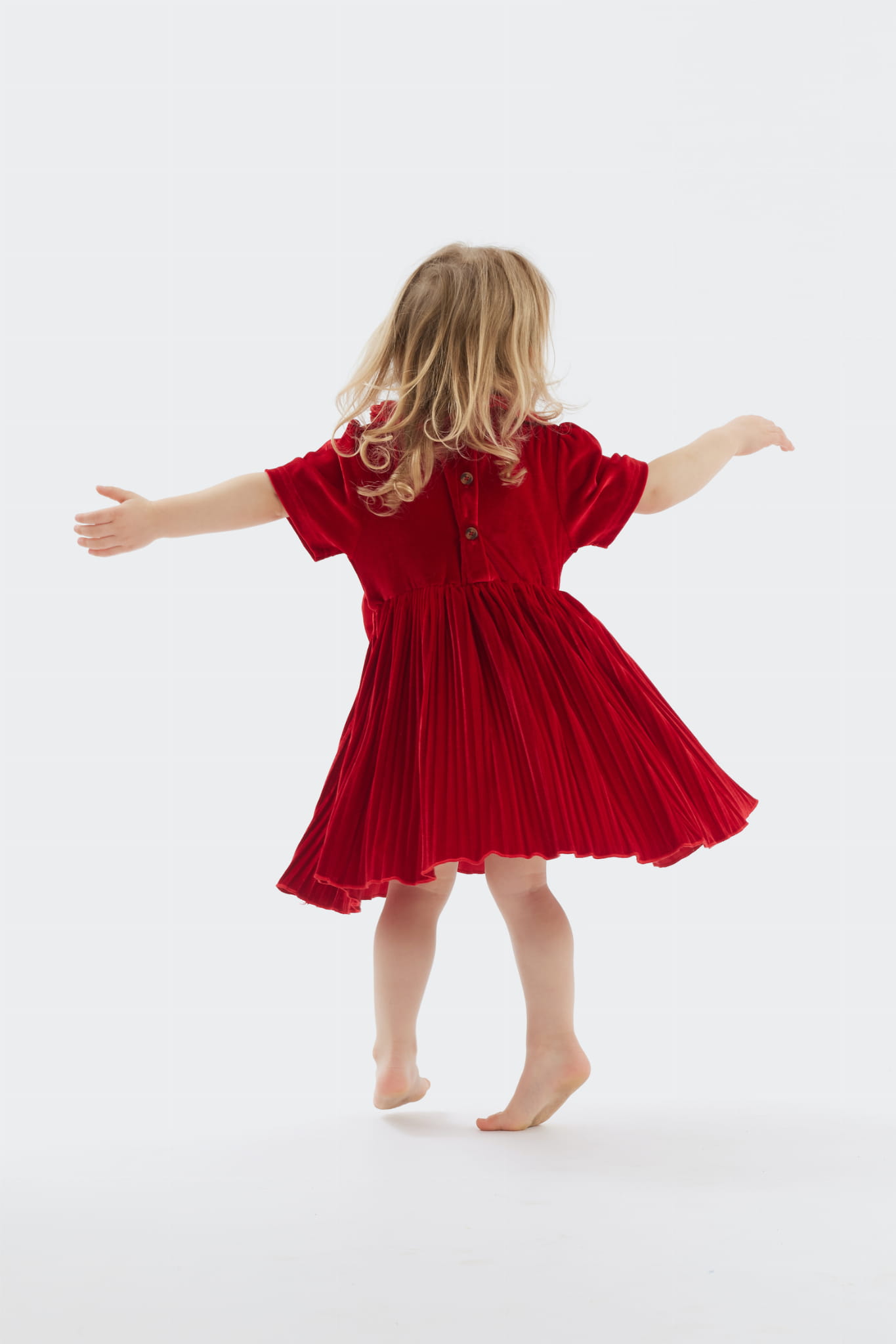 Ta žametno-tilasta obleka v rdeči barvi je prava okrasitev vsake priložnosti. Eleganco obleki dodajajo originalni ovratnik in nabrani spodnji del. Na zadnji strani je zapeta z gumbi, kar ji dodaja čar in olajšuje uporabo.