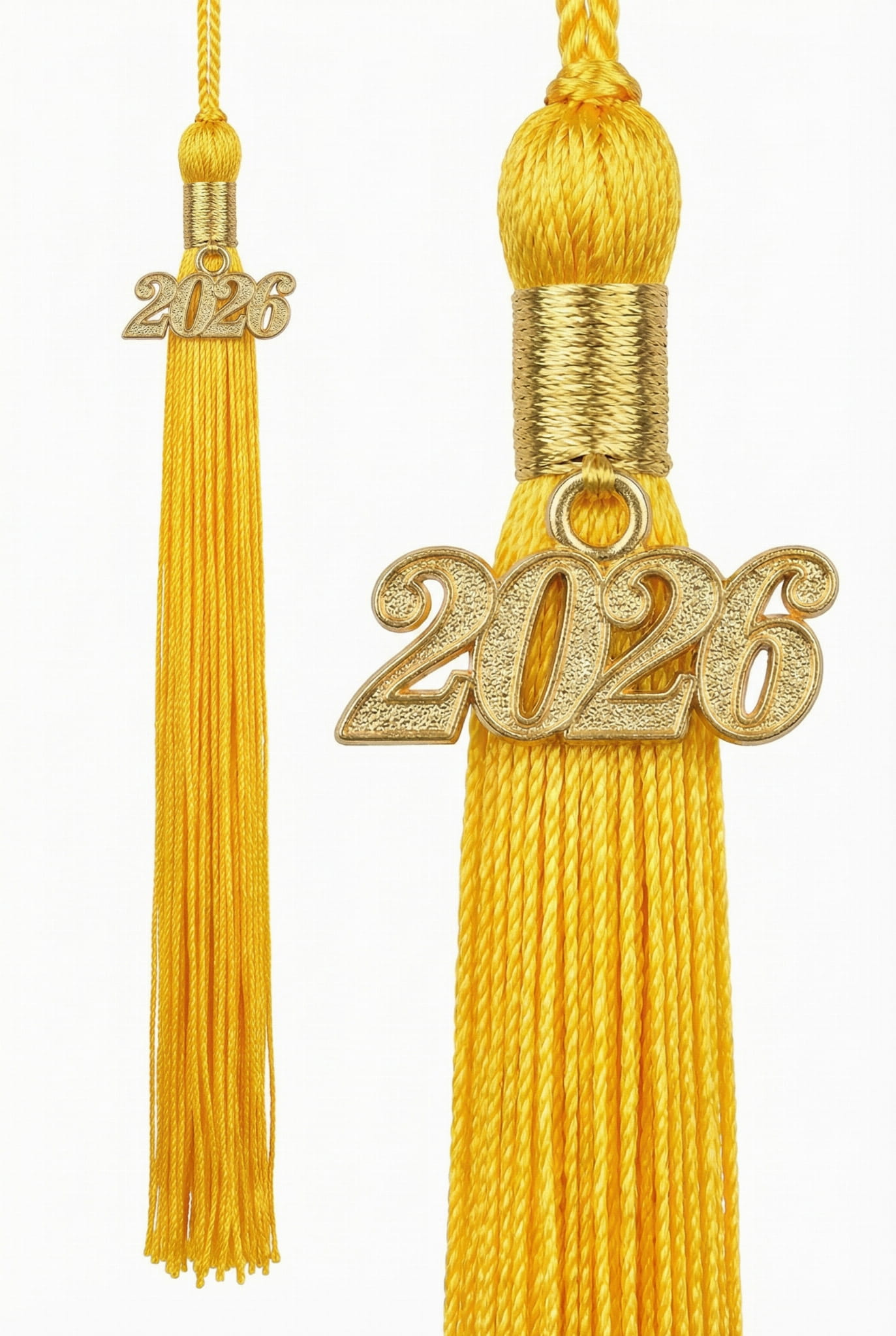 Rumena magistrska kapa tekočega leta z resico in obeskom – simbol uspeha in poseben spomin